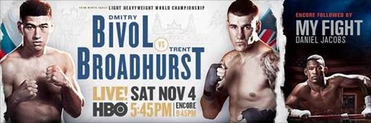 Bivol vs. Broadhurst is a 12-round bout for the WBA Light Heavyweight Title at Casino de Monte Carlo in Salle Medecin, Monte Carlo and televised live on HBO Boxing After DarkĀ® on Saturday, Nov. 4 at 5:45 p.m. (live ET/tape-delayed PT), coupled with a primetime evening replay at 9:45 p.m. (ET/PT).